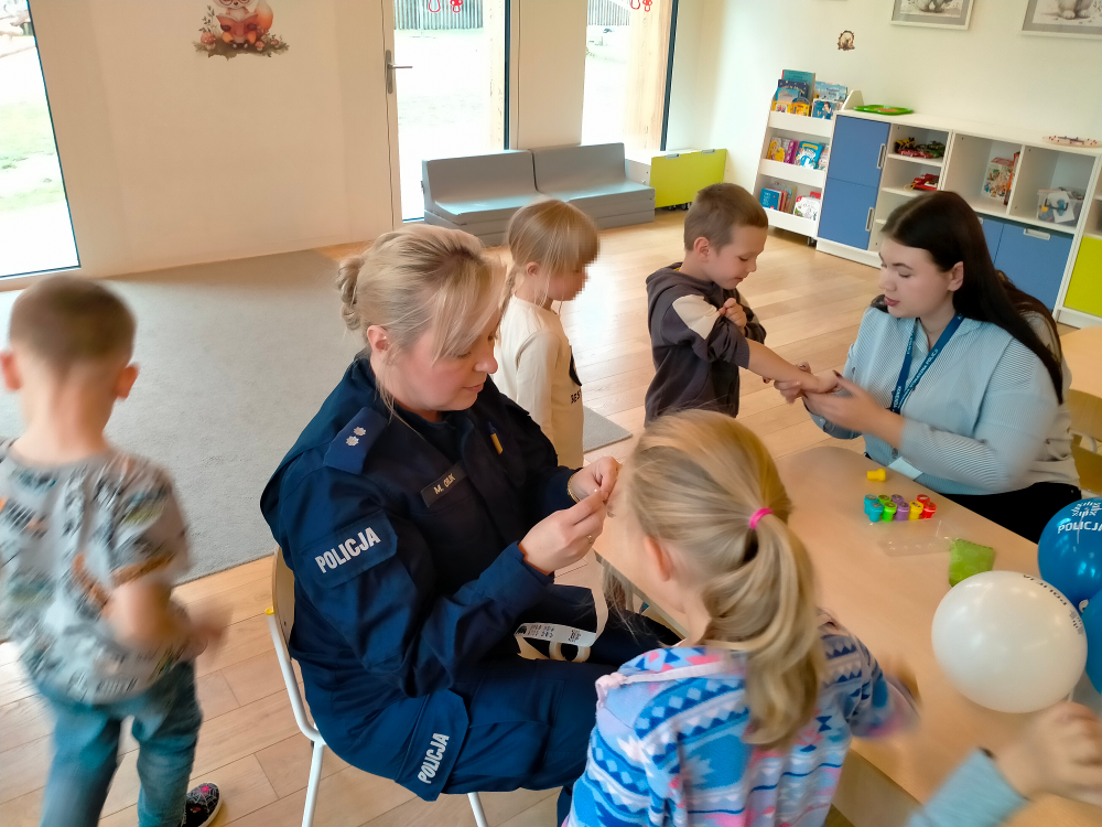 Podczas spotkania przedszkolaki miały również okazję poznać bliżej pracę policjanta. Podkom. Monika Orlik opowiadała o codziennej pracy policjantów, zaprezentowała elementy umundurowania i wyposażenia, które dzieci również mogły przymierzyć. Nie zabrakło też praktycznych ćwiczeń oraz pamiątkowych pieczątek- paluszków. W spotlkaniu uczestniczyła równiez mama jednego z przedszkolaków, która na codzień pracuje w naszej komendzie.
