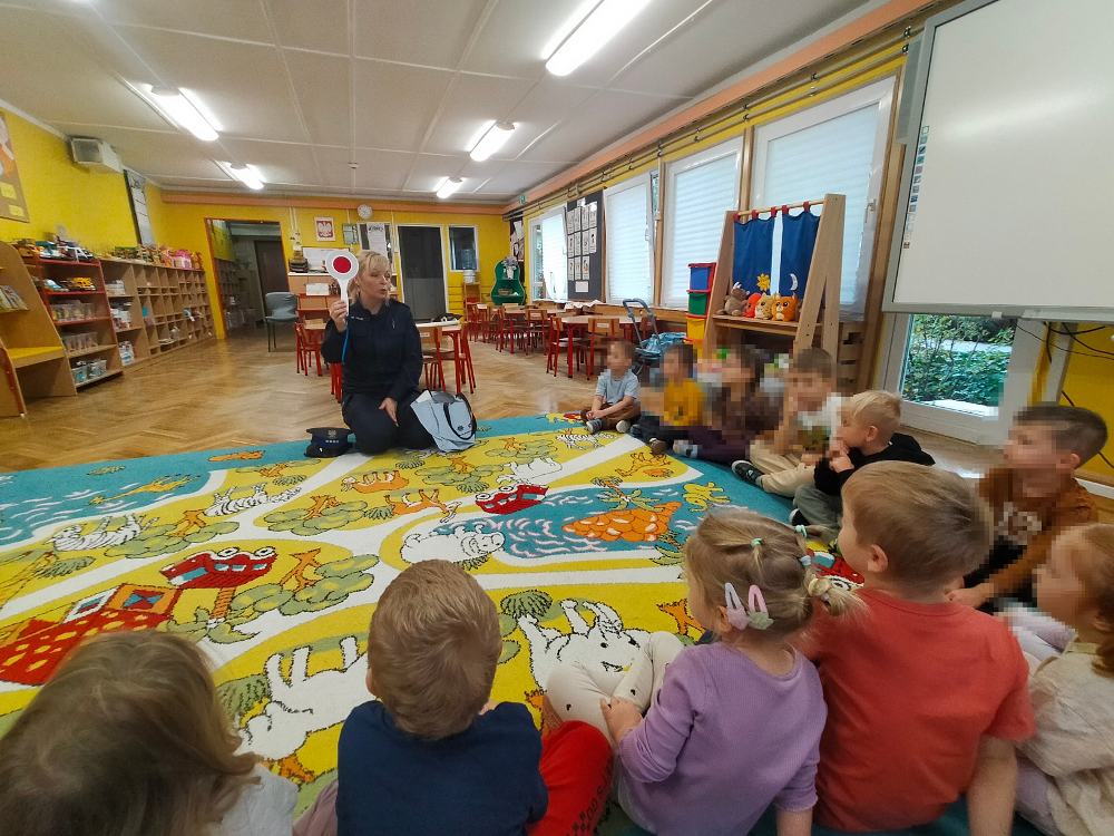 Podczas spotkania nie zabrakło rozmowy o bezpieczeństwie na drodze. Policjantka przypomniała, jak prawidłowo przechodzić przez jezdnię, jak ważne jest noszenie odblasków oraz jak zachowywać się w pobliżu ulicy. Dzieci chętnie odpowiadały na pytania i aktywnie uczestniczyły w rozmowie.