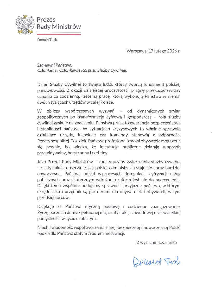 W liście podkreślono znaczenie profesjonalizmu, rzetelności oraz odpowiedzialności pracowników administracji publicznej, którzy każdego dnia realizują zadania na rzecz obywateli i sprawnego funkcjonowania państwa.