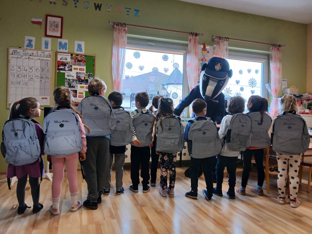 Na zakończenie spotkania mł. asp. Katarzyna Ambroziak, opowiedziała dlaczego odblaski są tak bardzo ważne, kiedy poruszamy się po drodze. Każde z dzieci w otrzymało odblaskowy plecak, aby zwiększać bezpieczeństwo w ruchu drogowym.